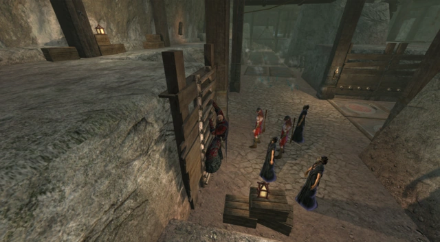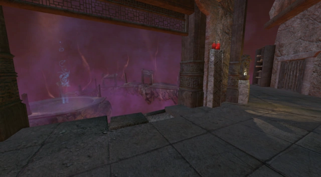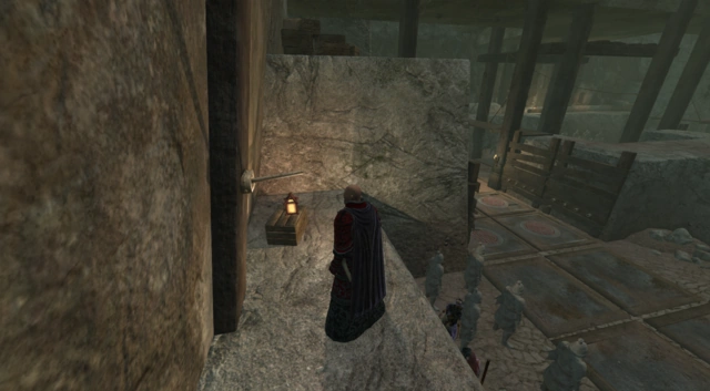 Now starts a small puzzle part. You have to cross the upper level to reach the south west corner, but there're wooden bridges that have to be moved around to free the way. That is done by pulling three levers placed across the room.