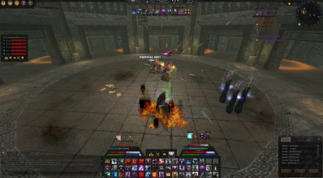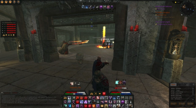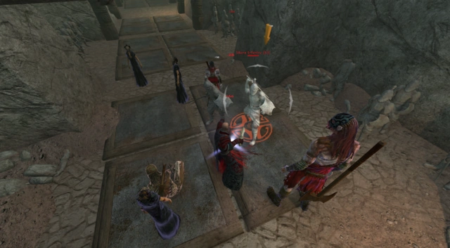 You'll reach a ritual chamber, where the "Refuge Corpse Waker“ resides, a level 83 Boss. She attacks you with spells and summons "Volatile Skulls“. Once these skulls reach you, they stop moving and start a cast called "Detonate“. When it completes, the skull is destroyed, doing moderate damage to anything near it, including the boss. Keep near to the boss, and move away as soon as any skulls stop near her. This will prevent you from getting hurt and deal some damage to her. The boss can be stunned. (Note: LL protection gear, or protection gear in general, is useful here. Also, soldiers, especialy Guardians, can simply stay on her and rotate Cunning Defense & Stall the Advance - much less moving about required).