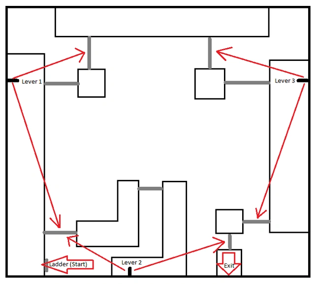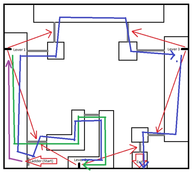- Blue line is the third run to lever No. 3 and the tunnel exit. You have to jump down to the ladder and stop at lever 3 during this run.