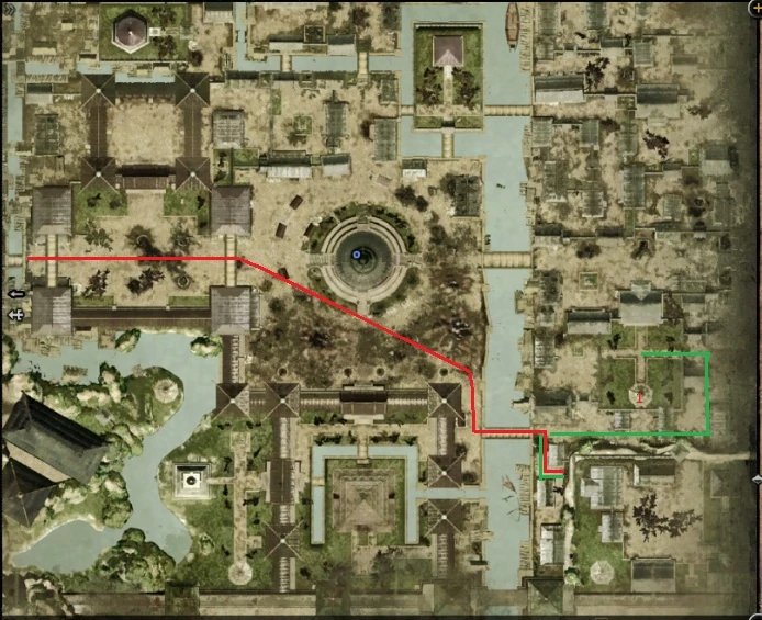 You start at the left side, follow the red line and run/sprint as fast as you can kite all mobs, behind the building where the red line end you reset the mobs, when all mobs have been reset you continue on the green line and kill the 7 mobs at the end. Then the boss is just South of your position.